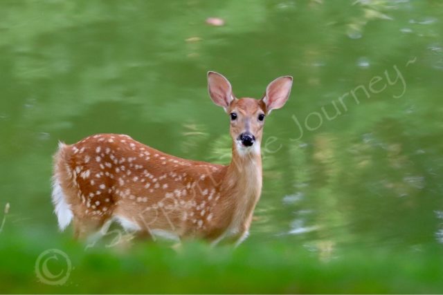 A photograph with two meanings. This sweet fawn was caught eating grass in front of the Support The Journey pond. The reflection of the trees on the pond surface along with the vibrant green grass surrounds the subject perfectly.